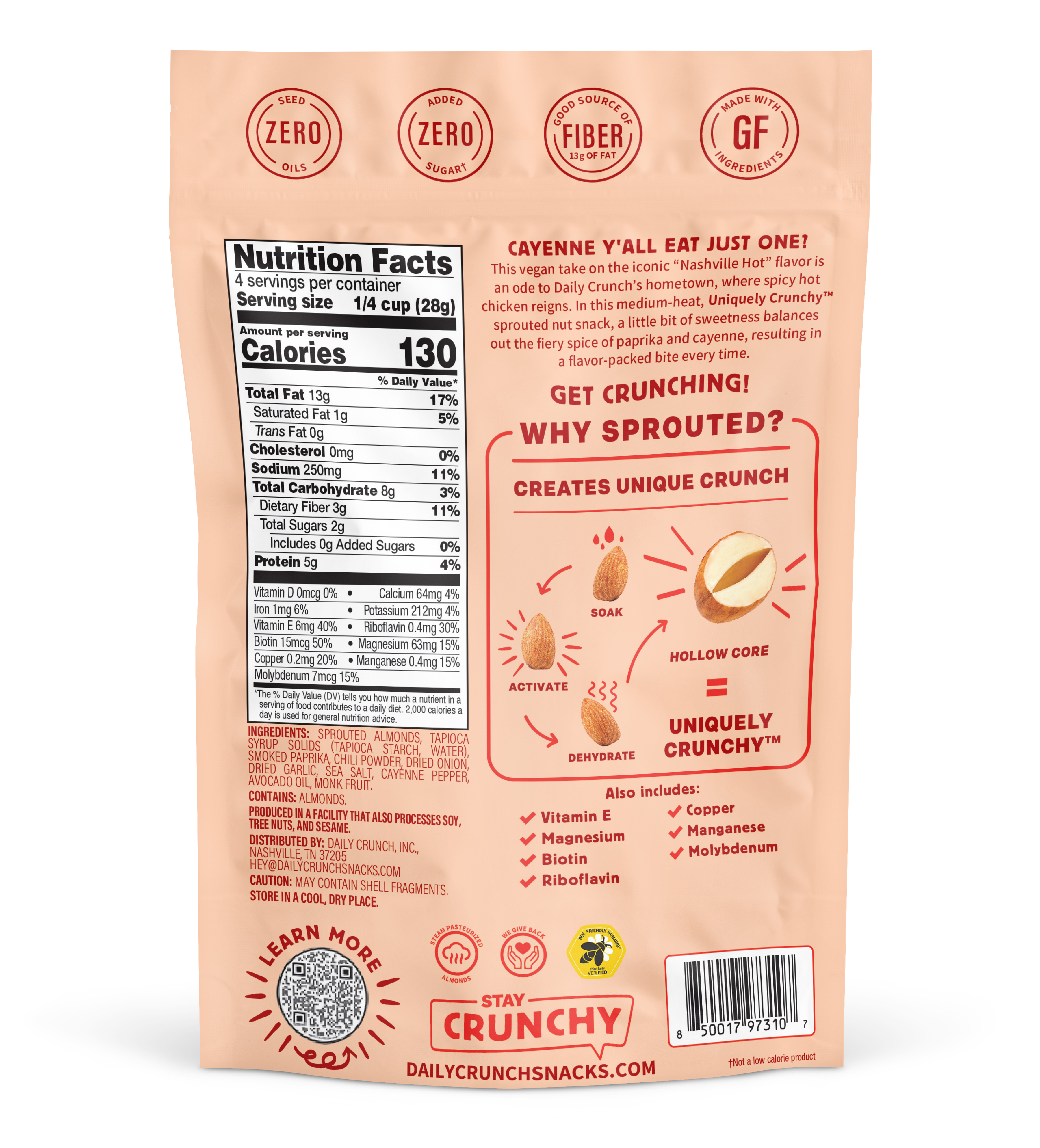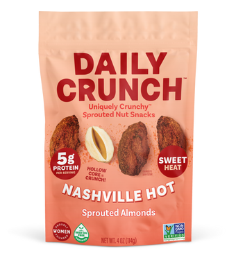 CAYENNE Y'ALL EAT JUST ONE? This vegan take on the iconic “Nashville Hot” flavor is an ode to Daily Crunch’s hometown, where spicy hot chicken reigns. In this medium-heat, Uniquely Crunchy™ sprouted nut snack, a little bit of sweetness balances out the fiery spice of paprika and cayenne, resulting in a flavor-packed bite every time. Get Crunching!